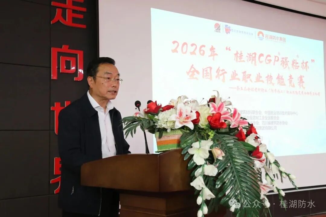 四川省建筑防水协会会长赵华堂致辞。他首先代表四川省建筑防水协会对莅临竞赛现场的人员表示热烈欢迎,并指出,当前防水行业已迈入高品质、高耐久、标准化的高质量发展新阶段,职业技能竞赛是培育工匠、锤炼技艺、树立行业标杆的平台。愿本次大赛成为全国防水行业技能提升、人才汇聚、技术互通的新起点,以竞赛赋能产业升级,以匠心守护建筑安全,携手全行业同仁共筑高品质好房子,共绘防水产业高质量发展新蓝图!